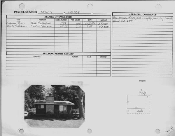 | 3 | 06/04/1992 | WARRANTY D | WARRANTY DEED | BARBARA L PHAIR | MARK G CRITCHLOW | 257 | | $59,000.00 | 199211436 | 920615205 |