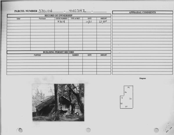 | Exterior Wall: | SI/ST | Fireplace: | WD ST-FAIR | | Floor Cov Adj: | Base Allowance | Foundation: | CONPR | | Full Baths: | 1 | Heating/Cooling: | WD/NO | | Number of Bedrooms: | 1 | Roof Covering: | COMP |